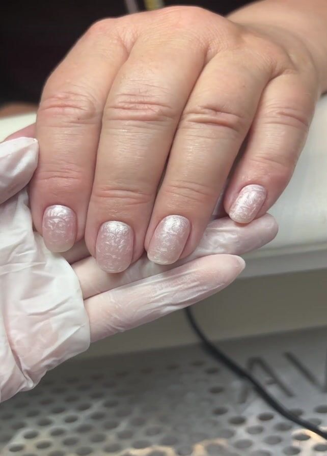 A close-up shot shows a hand with freshly manicured nails. The nails are a light, pearlescent color, possibly light pink or off-white, and have a subtle, textured pattern. The hand is being held by someone wearing white gloves, likely a manicurist or nail technician. The background is a blurred white surface, possibly a salon workstation, with a glimpse of a black cable or cord and a portion of a machine with the letter "V" visible. The overall setting suggests a professional nail care environment.