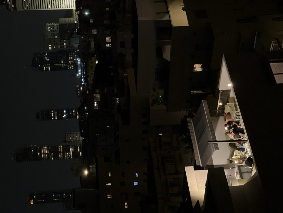 The image presents an elevated, wide-angle view of a city at night, specifically identified as Tel Aviv, Israel. The scene is dominated by a dark sky and the artificial lights of urban structures. In the mid-ground, a brightly illuminated rooftop terrace on a multi-story building serves as the focal point. Approximately six individuals are visible on this terrace. On the left side of the terrace, one person is seated at a table in an area equipped with an outdoor kitchen, including a counter, sink, and what appears to be a small refrigerator unit. Four other individuals are congregated around a seating arrangement consisting of a sofa and chairs on the right side of the terrace, engaged in social interaction. A dark-colored retractable awning covers a portion of the terrace. White, cube-shaped lights are affixed to the perimeter walls of the terrace. A standing fan is positioned near the seating area. The background reveals a dense urban skyline against a dark night sky. Multiple tall high-rise buildings with numerous illuminated windows are prominent, interspersed with various lower residential and commercial structures, also displaying internal lights. The overall environment is one of an active city illuminated after dusk.