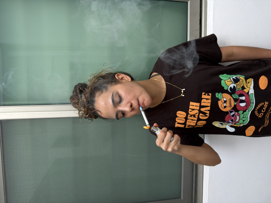 A woman with curly hair is positioned next to a gray-framed window. She's lighting a cigarette with a lighter, smoke drifting upwards. She wears a dark brown T-shirt with colorful cartoon fruit characters and the text "TOO FRESH TO CARE". A delicate gold necklace adorns her neck. The scene appears casual, possibly indoors, with the focus on the act of smoking and the woman's relaxed demeanor.