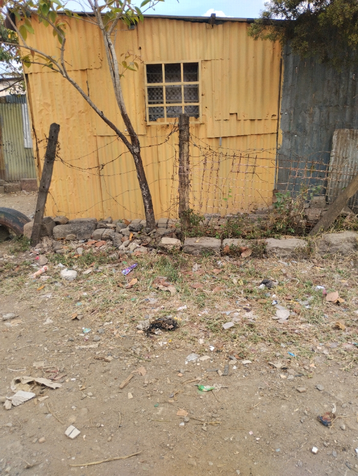 The image displays an outdoor scene in an informal settlement within Nairobi, Kenya, under daylight conditions. The foreground consists of an unpaved dirt surface, extensively covered with debris including plastic wrappers, paper fragments, small stones, and dried organic matter. In the mid-ground, a rudimentary fence is present, constructed from three rough wooden posts and multiple strands of barbed wire, augmented with sections of wire mesh. Behind this fence, sparse green vegetation and additional litter are visible, bordering a low retaining structure composed of rough-hewn stones and concrete fragments. The background is dominated by a single-story structure with walls made from corrugated metal sheets, painted a faded yellow/mustard color. This structure features a single rectangular window, fitted with a grid-patterned insert. To the immediate right, a section of an adjacent building, constructed from unpainted, grey corrugated metal sheets, is visible. A smaller, similar grey corrugated metal structure is partially visible on the far left. A thin-branched, largely deciduous tree stands in front of the yellow building, positioned to the left of the window. A small leafy bush is visible on the far right, adjacent to the grey corrugated structure. A discarded tire rests on the ground in the far left foreground. No individuals or animals are present in the scene.