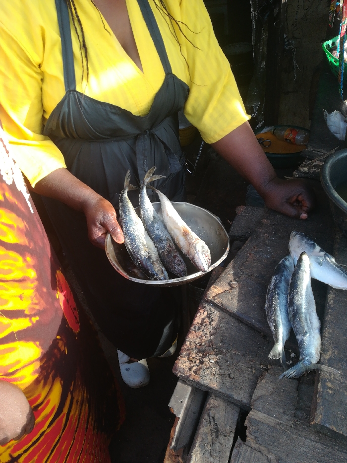 The image depicts a close-up scene at a fish market stall in Jos, Nigeria