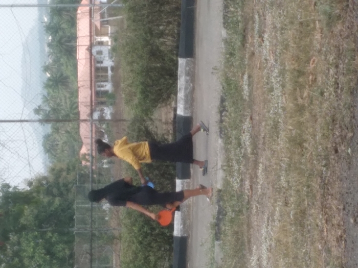 This image, set in Osu, Nigeria, depicts two females walking from left to right on a paved surface adjacent to a curb. The individual on the left wears a black long-sleeved top and a black long skirt, holding an orange paddle-like object in her right hand and a small blue object in her left. Her hair is dark and long. The individual on the right, slightly ahead, wears a yellow hooded sweatshirt and a dark long skirt or trousers, with her hair pulled back. She extends her right arm towards the first female's left hand. Both wear open-toed footwear. A concrete curb, painted with black and white stripes, separates the paved area from a strip of dry, patchy grass in the immediate foreground. Beyond the pedestrians, a row of green bushes fronts a chain-link fence topped with barbed wire. In the background, multiple white buildings with prominent terracotta roofs are situated amidst dense tropical foliage, primarily palm trees. Hazy hills are visible on the distant horizon under a diffuse daylight sky.