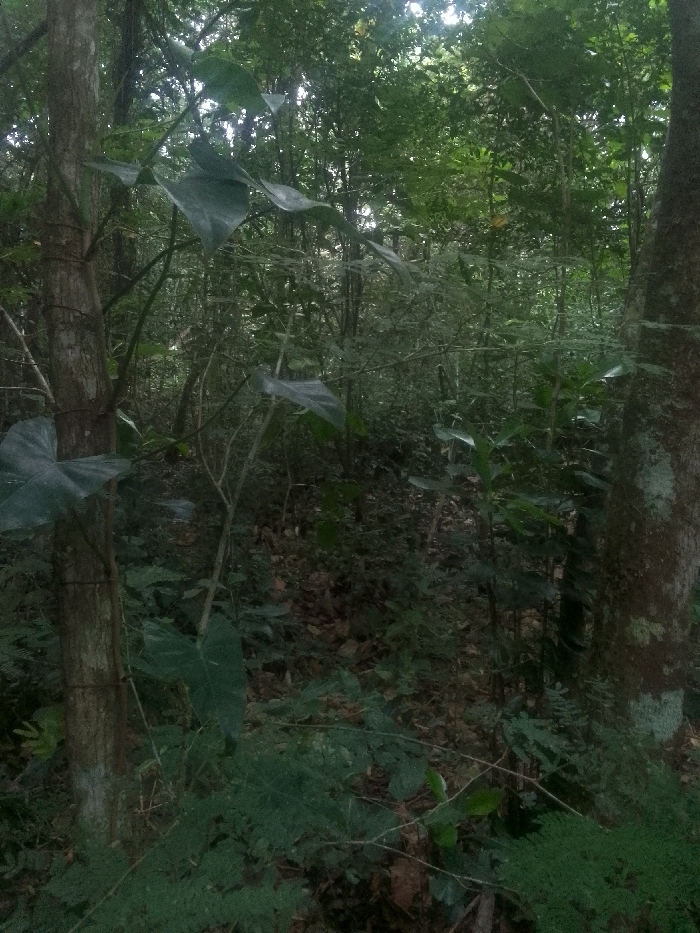The image depicts a dense forest interior. Two tree trunks frame the foreground, one on the left and one on the right. Vines and broad leaves climb the left tree. The forest floor is covered in leaf litter and dense vegetation. The background shows a thick collection of trees with a canopy obscuring most of the sky. The overall impression is one of a shaded, overgrown, and wild natural setting.