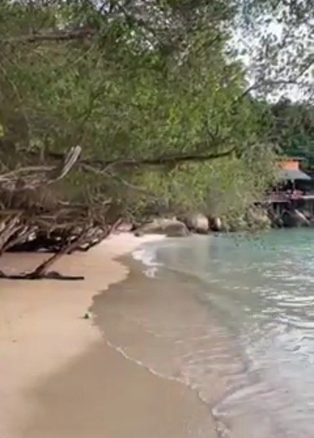 The video opens with a shot of a sandy beach, a tree with green leaves overhanging the shoreline
