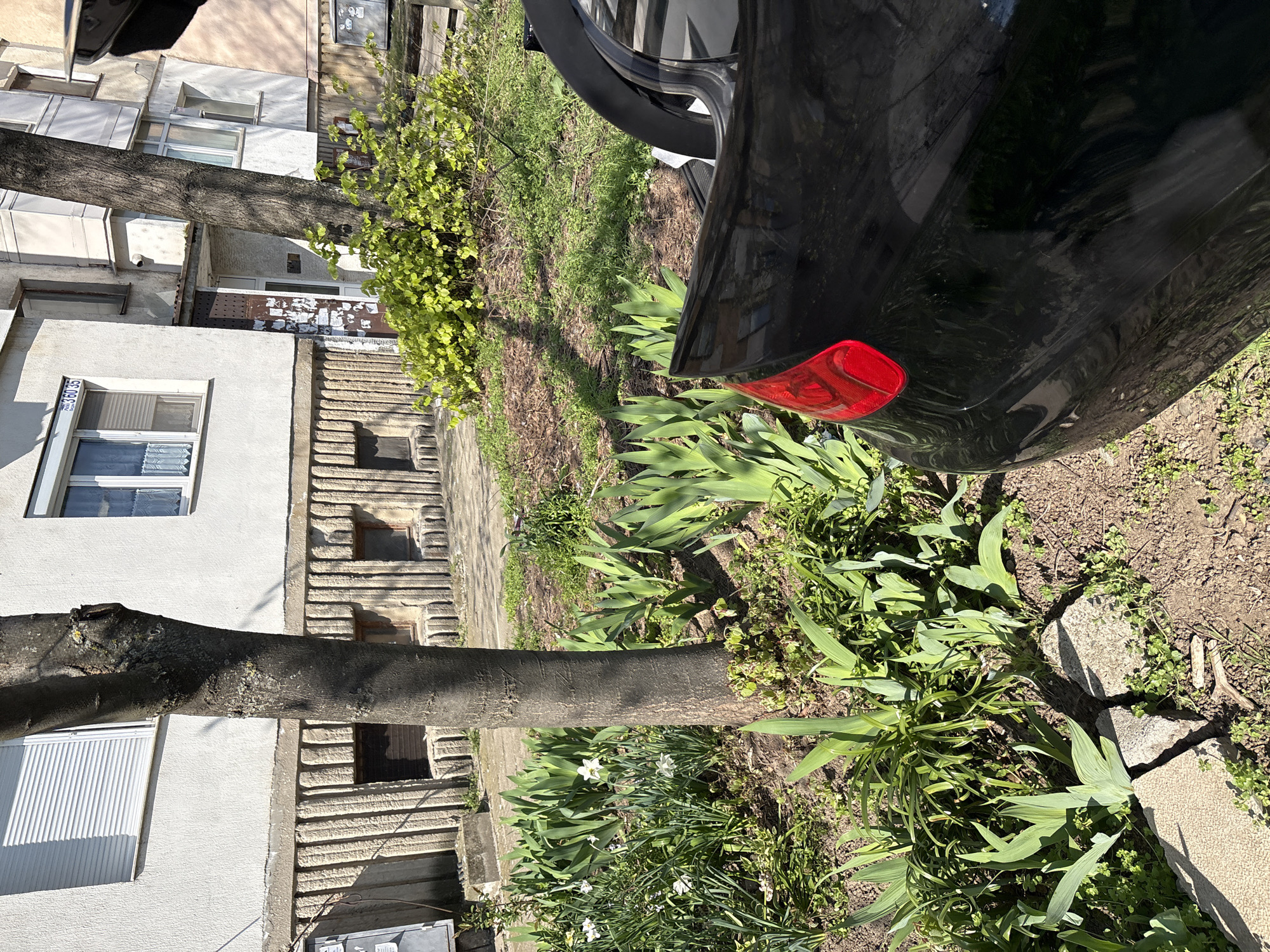 The image depicts a street scene in Vidin, Bulgaria. A black car is partially visible, obscuring the view of the street and buildings. The street is lined with trees and vegetation. A white residential building is seen in the background, featuring windows with white frames and white blinds. A set of concrete stairs with decorative elements leads up to the building. The ground is covered in grass, plants, and some dirt. The car's tail light is red and visible. The photo appears to be taken during the daytime in sunny weather.