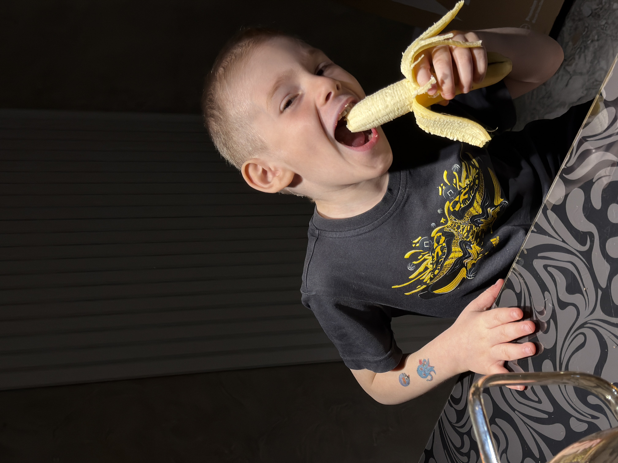A young child with blond hair is eating a banana indoors. The child is wearing a black t-shirt with a yellow design and has temporary tattoos on their left arm. They are sitting at a table with a black and grey swirling pattern. A metallic object, possibly part of the furniture, is visible in the bottom right corner. The background is dark and features horizontal lines, suggesting a wall or paneling. The location is Rossiyskiy, Russia.