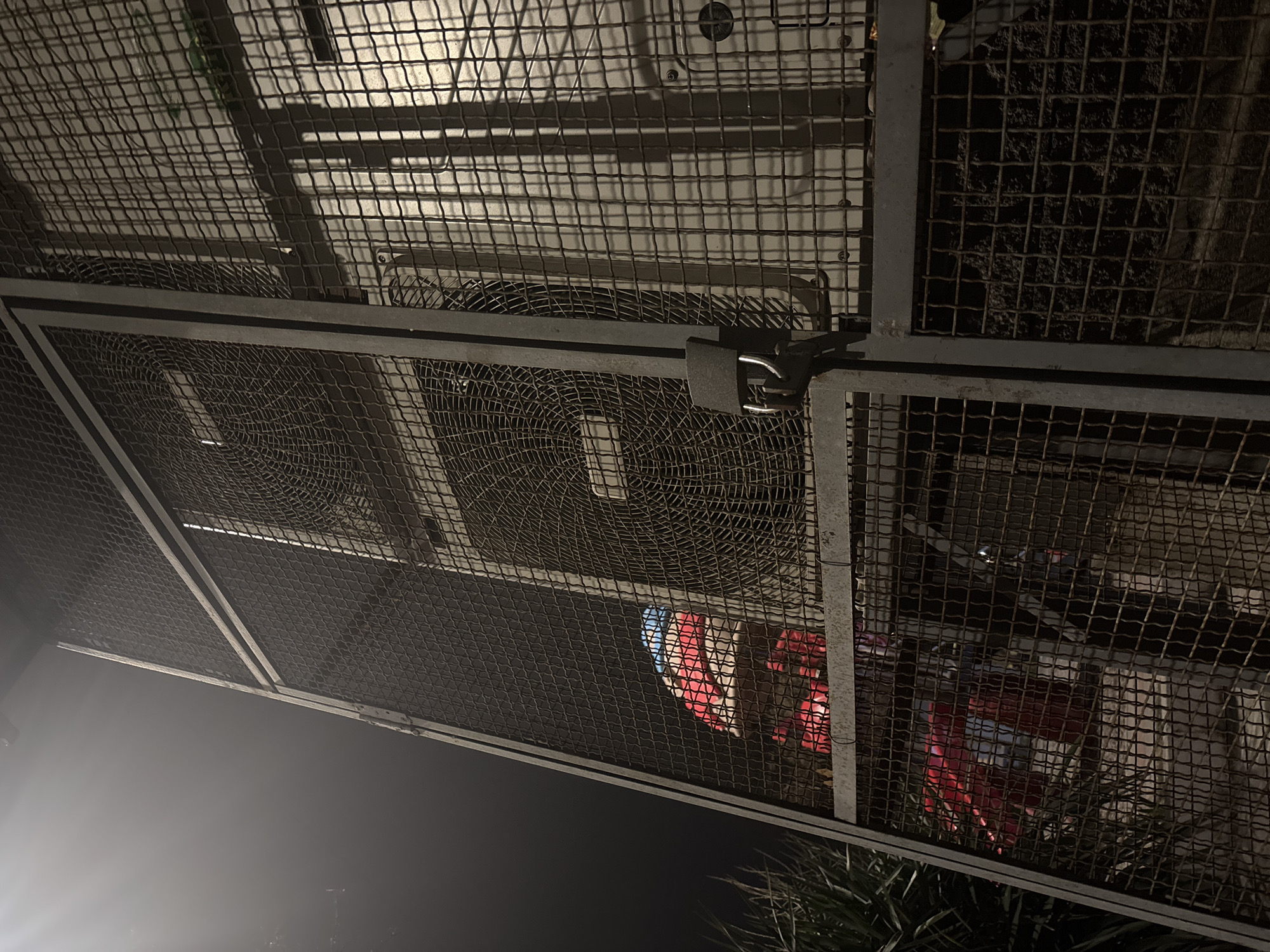 metal cage structure, possibly a security enclosure, with a lock visible on one side