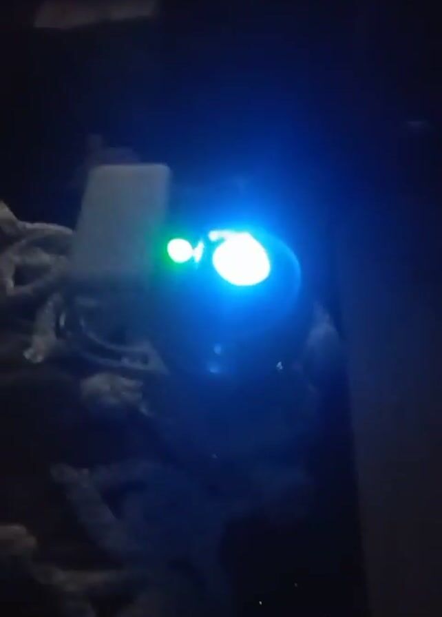 dark room with a light projector casting a green and blue nebula pattern on the ceiling, with many small green dots scattered among the colors