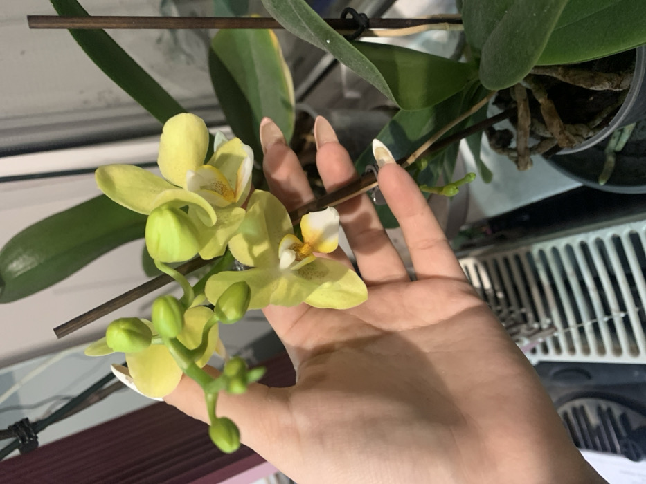 - "A close-up photograph taken in Lehchevo, Bulgaria, displays a yellow Phalaenopsis orchid in bloom, held by a human hand" by FM-CrvUt2, licensed under CC BY 4.0