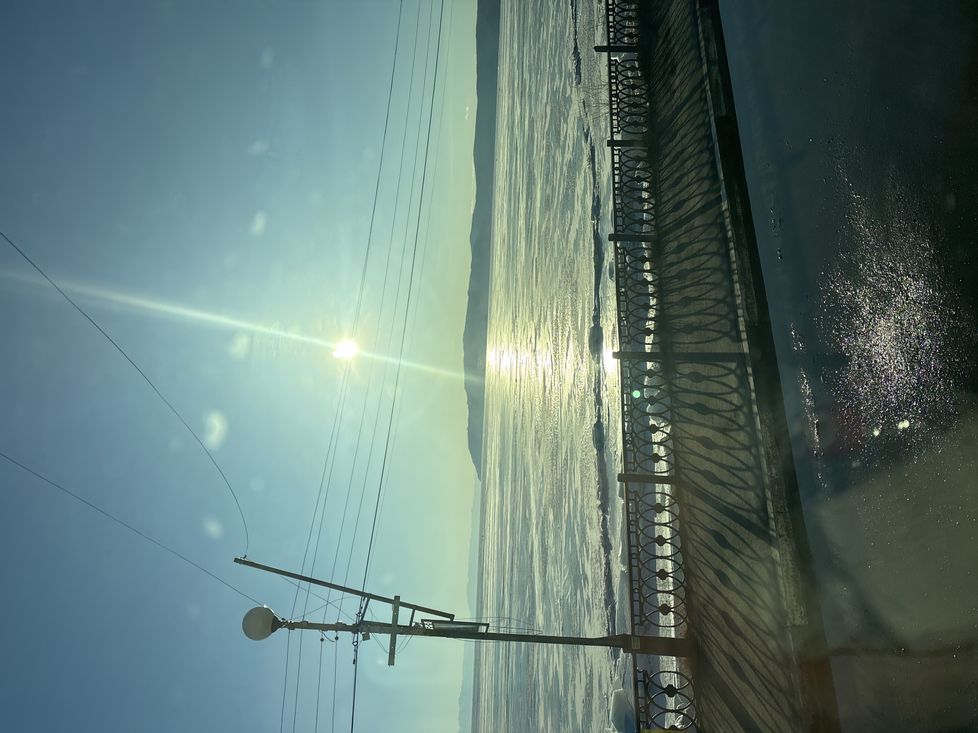 The image presents a winter daytime scene overlooking the frozen expanse of Lake Baikal from Listvyanka, Russia. A prominent, low-angle sun is positioned in the upper-left quadrant of a clear, light blue sky, generating significant lens flare and a brilliant, elongated reflection across the ice. The frozen lake, exhibiting textured snow and ice formations, extends to a distant horizon defined by dark, undulating hills. In the left foreground, a utility pole supports a spherical street lamp and multiple overhead power lines. A dark, decorative metal fence with a repeating circular motif runs horizontally across the lower mid-ground, bordering a dark paved surface. Long, distinct shadows of the fence's design are cast onto the paved area. The bottom right foreground reveals a glistening, dark, wet surface, possibly meltwater, reflecting light. No human subjects or discernible activity are present.