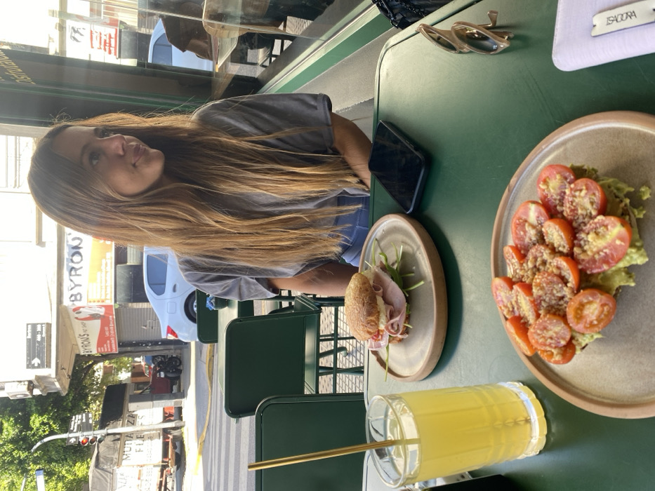 The image depicts a daytime scene from an outdoor cafe patio in the Palermo neighborhood of Buenos Aires, Argentina, specifically near the intersection marked by a street sign indicating "Molina" (blocks 400-300) and "Güemes A", identifiable by a "Byron's Pet Shop" sign (Güemes 4578). A sole female individual is seated at a dark green, rectangular outdoor table, positioned with her back partially to the camera, looking towards the right side of the frame. She has long, light brown hair and wears a grey short-sleeved t-shirt and light blue pants. Her hands are not visible. On the table in front of her are several items: * A clear glass containing a light yellow beverage with a golden metallic straw on the left. * Two round, light brown plates. The plate closer to the camera holds an open-faced avocado toast topped with halved cherry tomatoes and a brown granular topping. The plate further back contains a circular sandwich or bun filled with sliced ham, green leafy vegetables, and a white creamy substance. * A black smartphone in a dark case lies face down to the right of the sandwich plate. * A pair of light brown sunglasses rests further to the right. * A white rectangular object, possibly a wallet or small notebook, with "ZACOORA" printed on it, is partially visible on the far right. The background reveals a bustling city street under natural daylight. A white crosswalk is visible. Parked vehicles include a white sedan, a dark motorcycle, and a white truck with "MUDA ZAS FLETES" (removals and freight) written on its side. A two-story building houses "BYRON'S PET SHOP" with red and white signage, also indicating "PELUQUERIA" (hairdressing) and "BAÑOS" (baths). A street pole with a red traffic light and the aforementioned street sign is on the left. Green trees are visible towards the left side of the street, indicating urban vegetation. The scene shows no direct interaction between the seated individual and others, suggesting a solitary meal or waiting.