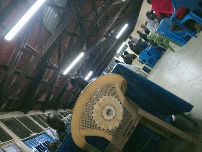 An indoor shot features a gathering of people in what appears to be a church or large hall. The angled perspective draws attention to the ceiling's metal beams and fluorescent lighting. Seated individuals are visible in the background, many in blue chairs. A person sits at a table covered with a blue cloth in the foreground. A white plastic chair with a floral pattern on the back rests against the table, partially obscuring the view. The room has a simple, functional design.