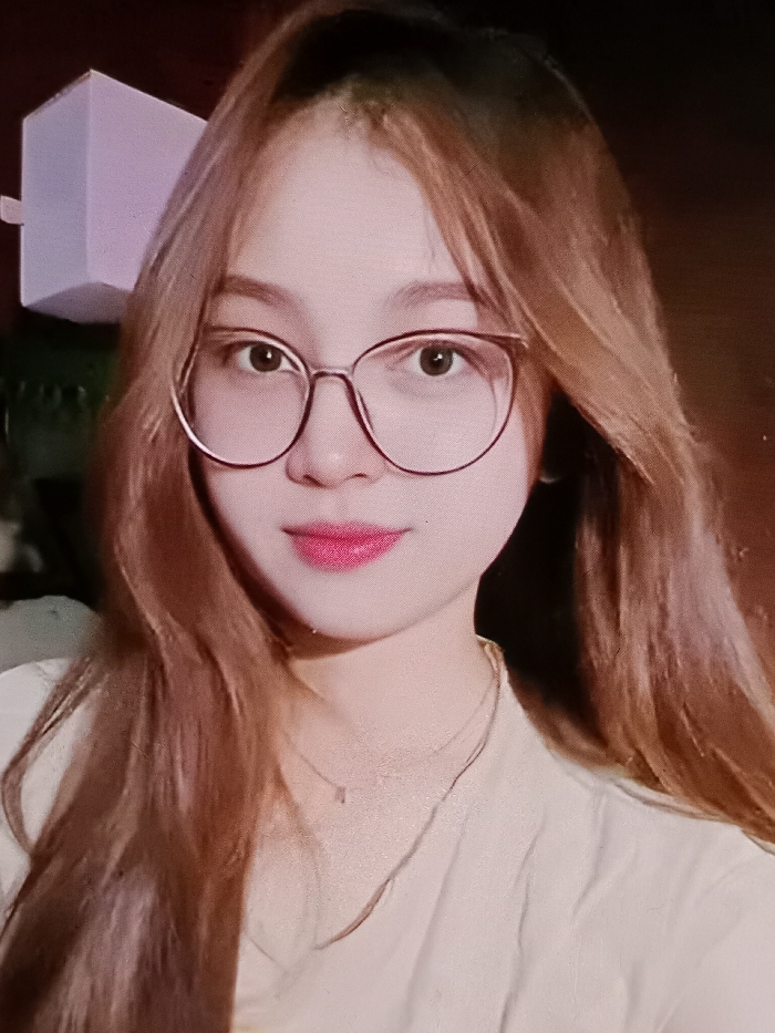 A portrait photograph displays a single individual, identified as a young female, positioned centrally and looking directly forward. She has long, light brown hair parted down the middle and wears round-framed glasses with thin, light-colored rims. Her lips are accented with bright pink lipstick. She is wearing a light-colored, possibly beige, collared garment, and a thin chain necklace with a small, dark pendant is visible around her neck. The background is dark and blurred, suggesting an indoor environment. A light-colored, rectangular object, possibly a light fixture or decorative box, with a pale purple hue is partially visible in the upper-left portion of the frame. The scene is situated indoors, within the city of Bekasi, Indonesia.