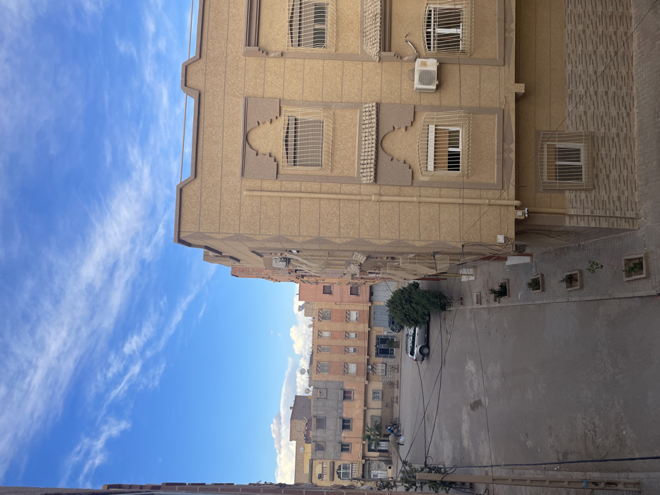 The image captures an urban street scene in Arfoud, Morocco, viewed from an elevated perspective. In the immediate right foreground, a multi-story building features a textured, light brown stucco facade with decorative, arched architectural elements outlining its windows. All visible windows are equipped with white metal security grates. Multiple external air conditioning units are mounted on its exterior. The lower section of this building displays a patterned facade composed of brown and beige rectangular tiles. The ground level reveals an unpaved or dirt-covered street leading into the mid-ground. Along the right side of this street, a paved sidewalk is visible, featuring a series of regularly spaced square planters containing small, sparse vegetation. Electrical wires are prominent, crisscrossing the upper and mid-portions of the frame, connecting to utility poles and buildings. In the mid-ground, a light-colored SUV is parked on the left side of the street, facing away from the viewer. A dark-colored vehicle is partially obscured behind it. Further into the background, a cluster of additional multi-story buildings, varying in color from pinkish-orange to grey and brown, line the street. Some of these structures have satellite dishes visible on their rooftops. In the distant left background, two individuals are present; one appears to be operating a bicycle or scooter, while the other stands nearby. The sky above is clear blue with scattered, wispy white clouds.