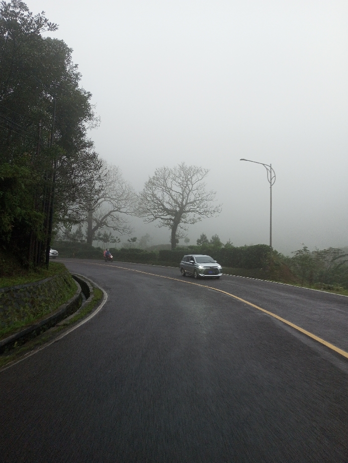 The image depicts a foggy road scene in Dawathang_Dorjibi_ Kashingtsawa, Bhutan