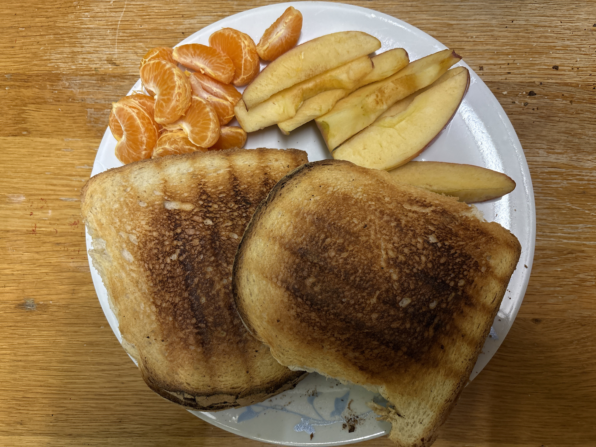 This image depicts a meal served on a white ceramic plate with a faint blue-grey pattern on its left side, situated on a light brown wooden surface. The meal consists of two halves of a diagonally cut, heavily toasted sandwich exhibiting significant browning and some minor charring, with light-colored filling visible at the edges. To the upper right of the sandwiches are numerous peeled clementine or mandarin orange segments. Below these segments, in the lower right portion of the plate, are several slices of a yellow-fleshed apple, some retaining red peel edges. The wooden surface displays vertical grain lines and minor surface imperfections. This scene is located in Oswestry, United Kingdom. No individuals, actions, or interactions are visible.