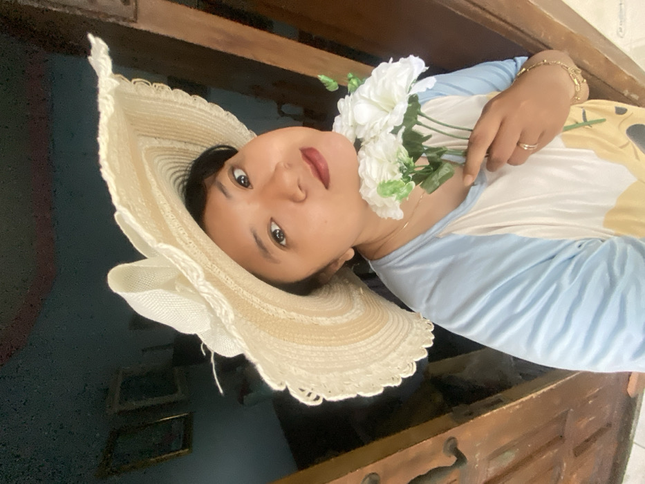 - "A woman is posing with a wide-brimmed straw hat adorned with a frilly edge, holding white flowers near her chest" by FM-htxI33, licensed under CC BY 4.0
