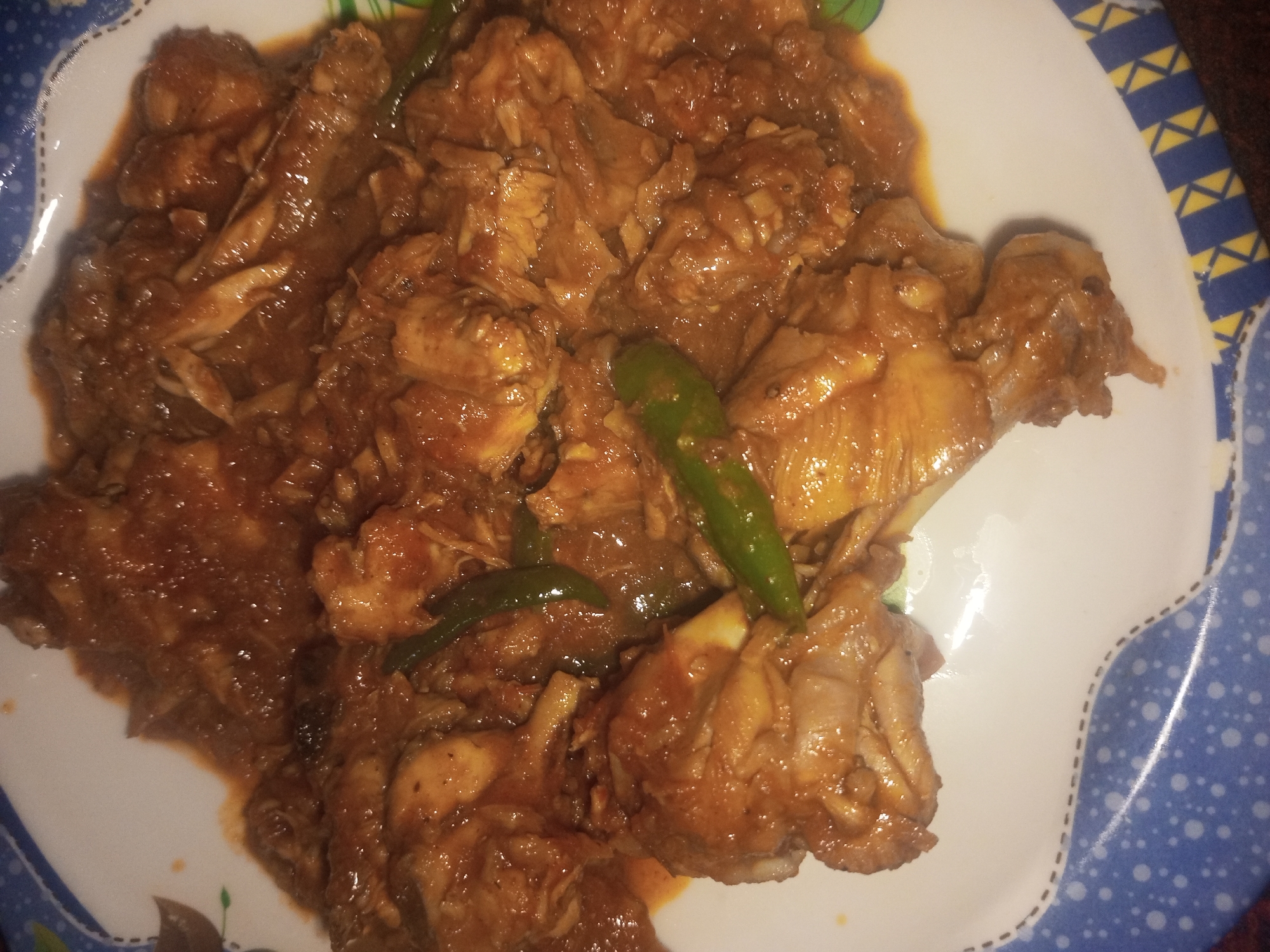 plate of chicken curry. The chicken pieces are coated in a dark reddish-brown sauce and garnished with green chili peppers. The plate is white with a blue and white patterned rim. The image appears to be taken indoors, likely in a home in Mansehra, Pakistan. No people are visible.