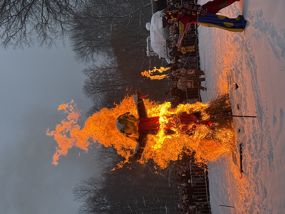 A large figure engulfed in flames dominates the foreground, appearing to be part of a winter celebration. Snow covers the ground. Behind the figure, a crowd of people observes the event, with some individuals holding burning torches. The background features bare trees against an overcast sky. A figure wearing a colorful costume is partially visible in the upper right corner.