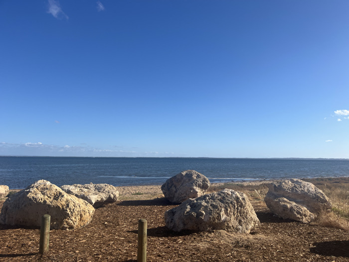 The image displays a coastal environment in Coodanup, Australia. The scene is dominated by a vast expanse of dark blue water under a clear, bright blue sky containing a few small white clouds. In the foreground, the ground is covered with dark brown wood mulch. Five prominent, light-colored, irregularly shaped boulders are positioned across the mid-ground, resting on the mulched surface and extending towards the water. Two short, light-brown wooden posts are partially visible in the immediate foreground, protruding from the mulch. Between the boulders and the water, a narrow strip of sandy or gravelly beach is visible, sparsely covered with dry, light-brown grass and reeds. A faint landmass is discernible on the distant horizon across the water. No individuals, animals, or specific actions are observed within the frame.