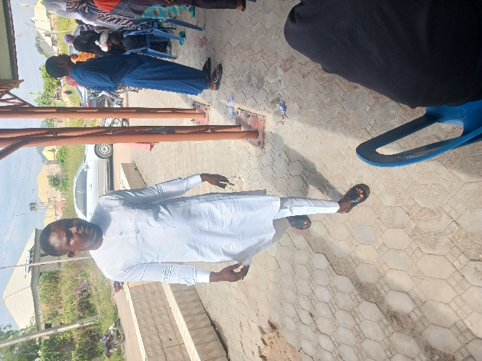 The scene depicts an outdoor public area in Nagazi, Nigeria. A dark-skinned male, wearing a white long-sleeved tunic and matching trousers with dark open-toed sandals, walks forward across hexagonal interlocking concrete pavers, his left foot lifted. He is looking towards the observer's right. To the right, several individuals are present under a structure supported by brown metal pillars. A man in a blue tunic and dark sandals stands facing right. Other people, including women wearing head coverings and children, are partially visible, some seated on blue plastic chairs. In the lower right, a blue plastic chair is partially visible alongside the lower torso and legs of a person dressed in black. The background features a dirt road with a silver sedan parked on its left side and a motorcycle partially obscured by vegetation. Various buildings, some appearing residential, and a water tank on a stand are visible in the distance under a clear sky. Utility poles are present on the left. The ground near the pillars shows scattered small pieces of litter.