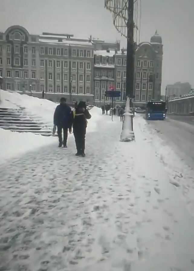 snow-covered urban landscape on an overcast day. Two people walk along a snow-covered sidewalk. Beside the sidewalk, a snow-filled slope rises to a set of stairs. Across the street, a blue bus drives past in the opposite direction. In the background is a tall, light-colored, multi-story building. Other pedestrians can be seen walking in the distance.