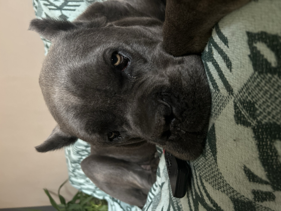 - "An indoor scene is depicted, featuring a large, dark grey Cane Corso type dog lying prone on a patterned blanket" by FM-p9lyZ2, licensed under CC BY 4.0
