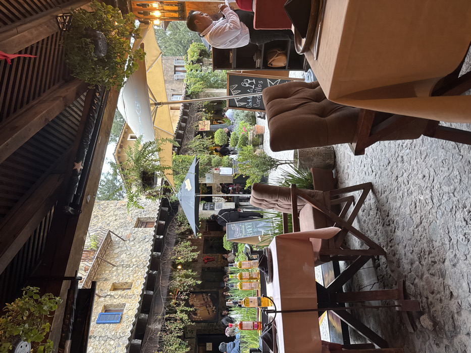 This image captures an outdoor restaurant or cafe patio located in Domingo Arenas, Mexico, featuring a cobblestone ground and stone buildings