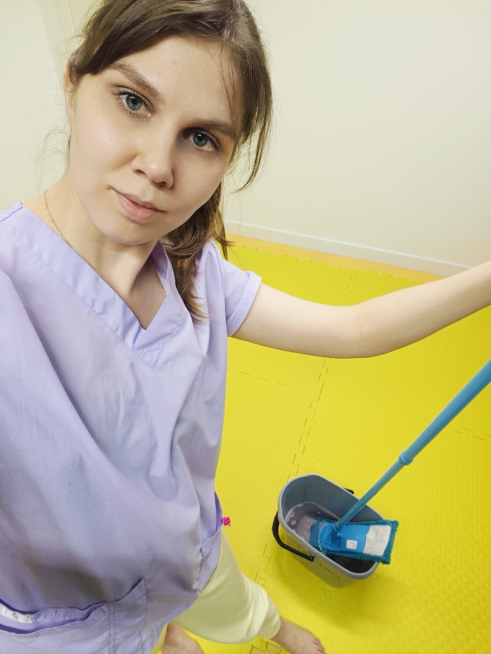 A woman is taking a selfie while mopping. She is wearing light purple scrubs and light pants, while barefoot. She has fair skin, blue eyes, and brown hair loosely tied back. A mop bucket sits on a yellow tiled floor, containing a blue flat mop and some water. The background includes an off-white wall. The photo is taken from a high angle, emphasizing the cleaning task and the woman's involvement.