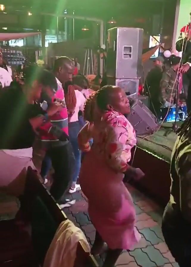 In a dimly lit indoor venue with green stage lights, a live band performs on a stage covered with artificial turf. The lead singer, wearing a red and white jacket and black pants, stands at the microphone while another band member plays the violin. A large screen displays a visual behind the stage. A crowd of people stands in front of the stage, dancing and enjoying the music. A woman in a floral shirt and pink skirt dances enthusiastically. The floor is tiled with a geometric pattern. A speaker sits on the left side of the stage. A couple stands close to each other, also dancing to the music.
