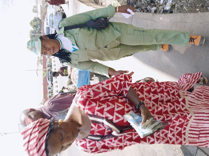 An outdoor scene in Communauté rurale de Payar, Senegal, depicts a street environment under bright daylight. In the foreground, two women walk from left to right on a paved sidewalk. On the left, an older dark-skinned woman with a serious expression looks downwards. She wears a red and white patterned traditional dress featuring geometric triangles on the upper portion and vertical stripes on the lower. A matching striped headwrap covers her head. She displays gold hoop earrings and a dark bracelet on her right wrist, which holds a substantial stack of banknotes. A black and white patterned strap from a shoulder bag is visible over her left shoulder. She wears light-colored sandals. To her right, a younger dark-skinned woman with braided hair looks forward and slightly left. She wears a light green, long-sleeved uniform consisting of a collared shirt with breast pockets and cargo pants, paired with orange work boots featuring black laces. A white t-shirt with a green V-neck and a partial "VC" or "YC" logo is visible underneath her uniform shirt. She wears a matching light green cap with a white and green logo. A small black messenger bag hangs over her left shoulder, and she holds a small white paper or card in her right hand. In the mid-background, partially obscured by the foreground woman, a bald dark-skinned man in a maroon shirt is visible, looking right. Behind him, a market stall with assorted goods, possibly produce, covered by a light blue tarp, is attended by another individual. The background reveals a street with multiple cars, some parked and others potentially in motion, separated from the sidewalk by a curb and a median strip marked with dark bollards. A low reddish-brown wall or building is visible in the far background under a clear sky. Debris is visible along the edge of the sidewalk on the right.