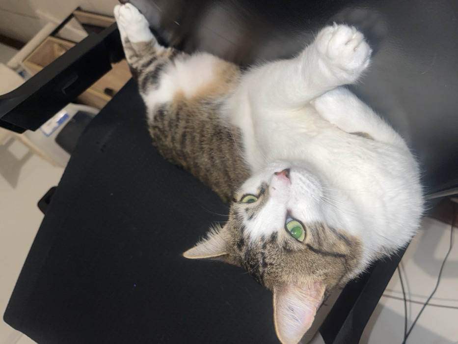 - "A domestic cat is depicted lying on a flat, dark surface, likely a desk or table, within an indoor environment" by FM-xxu5D3, licensed under CC BY 4.0