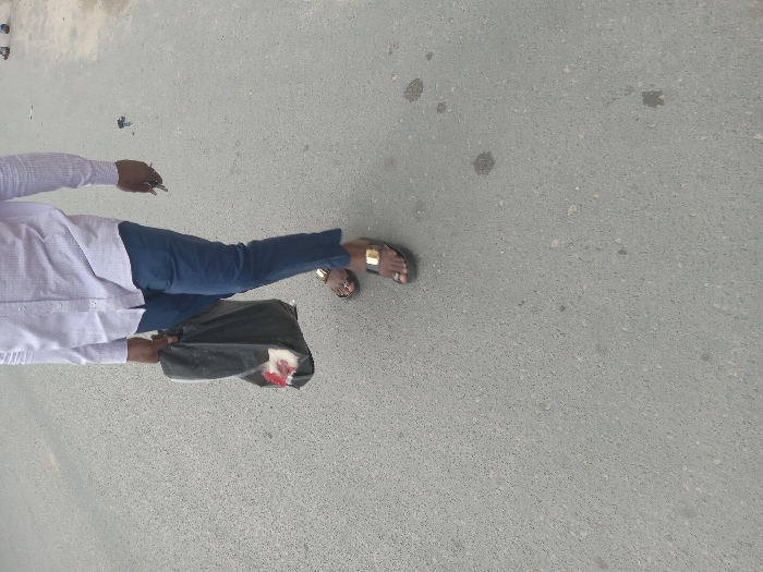 An individual is depicted walking on a light grey asphalt road in Ura Nta Umuarandu, Nigeria. The person, whose mid-torso to feet are visible, wears a light-colored, long-sleeved button-down shirt, dark blue trousers, and dark sandals with gold-colored straps. The individual's left hand carries a black plastic bag from which a white chicken, identifiable by its visible red comb and wattle, is partially emerging. A set of keys is held in the individual's right hand. The asphalt surface exhibits scattered dark stains.
