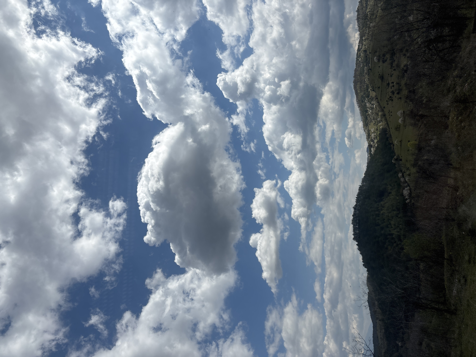 view from Klisura, Bulgaria, looking up at the sky and a forested hillside