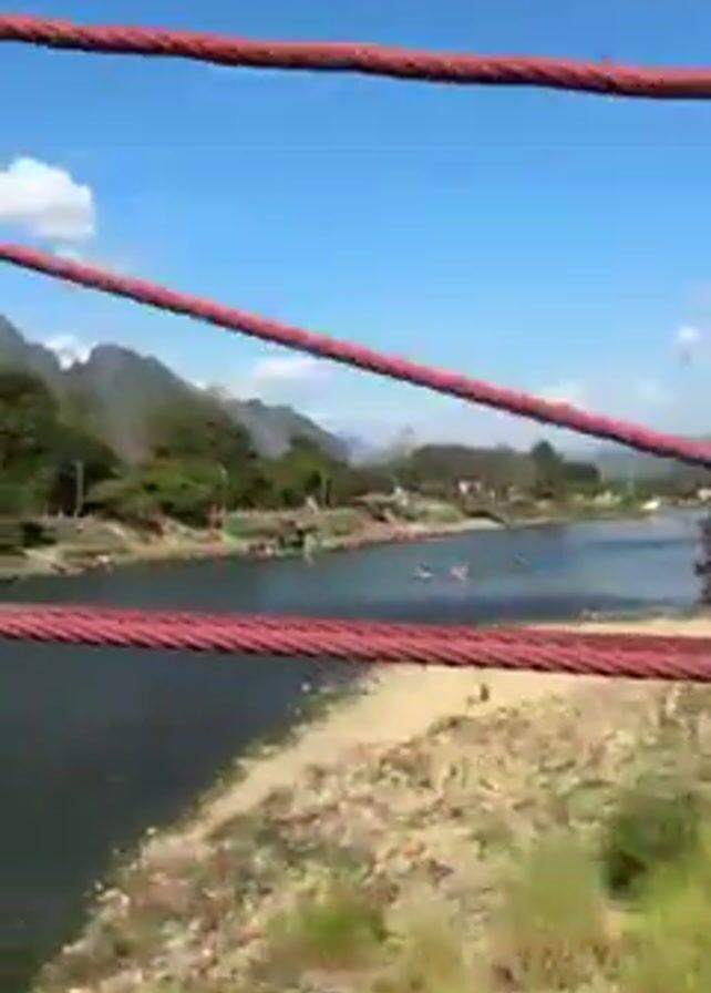 The video captures a scene from a bridge with red suspension cables, overlooking a river. The water appears calm, with a group of people tubing or kayaking on the river. The banks of the river are lined with greenery, trees, and some sandy areas. In the background, there are mountains under a clear blue sky with some scattered clouds. The camera seems to be moving, suggesting a walk or movement across the bridge.