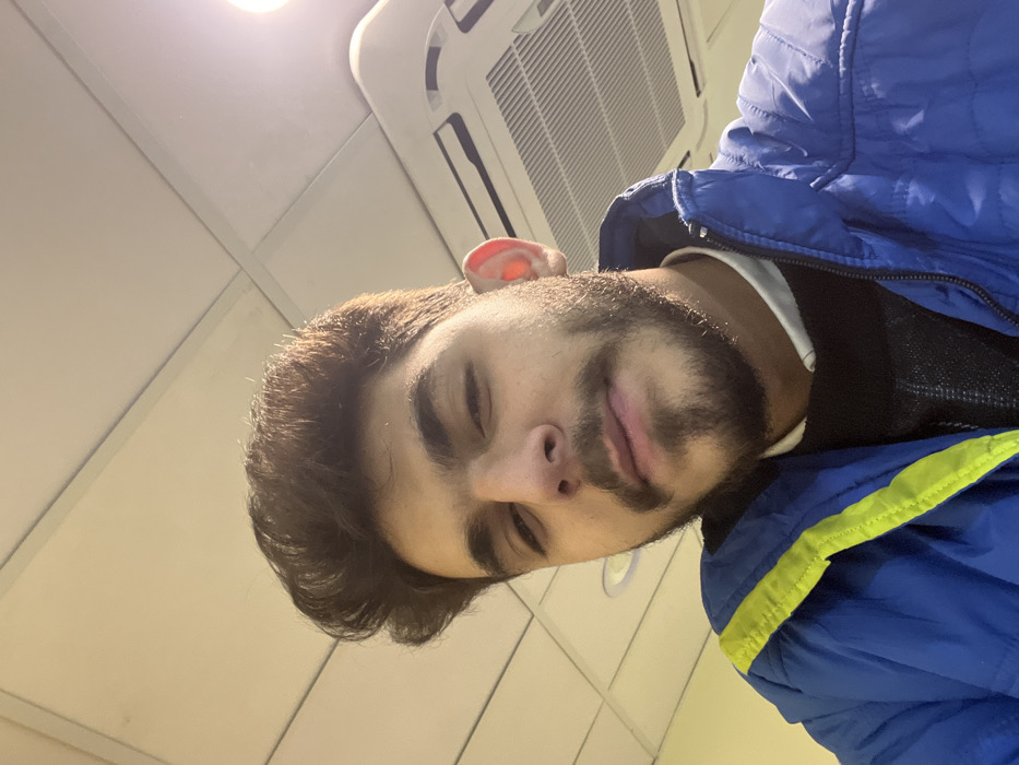 The image displays a head-and-shoulders close-up of a young adult male in an indoor setting within the city of Al-Mazza Municipality, Syria. The male, positioned centrally and slightly angled upwards towards the camera, has dark brown, volumed hair, dark eyebrows, and a dark beard and mustache. He is wearing a blue puffer jacket featuring a prominent yellow stripe on the left side, over a dark-colored sweater and a white collared shirt. His gaze is directed forward, meeting the camera. The background consists of a light-colored drop ceiling with visible grid lines and several recessed circular light fixtures, one of which is illuminated and visible in the upper left. A white, rectangular overhead air conditioning unit with parallel vents is present in the upper right quadrant of the frame. The lighting is artificial and bright.