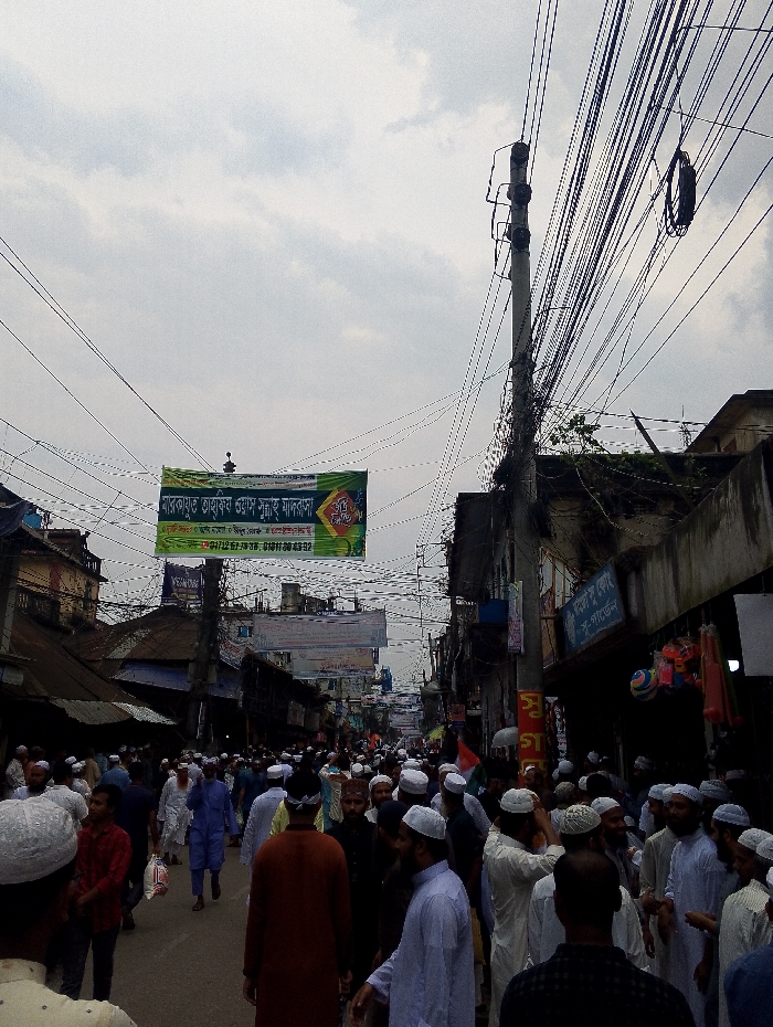 A large crowd of people, primarily men, are walking down a street in the city of Bhola, Bangladesh, at coordinates 22.685 latitude, 90.645 longitude. Many of the people are wearing white, and some are wearing traditional South Asian clothing. Some are holding small bags or packages. Several people are walking in groups while others are walking alone. There are many overhead electrical wires and poles. There are also some buildings on both sides of the street, including one that has a sign written in Bangla. The street is paved and appears to be busy with foot traffic. Above the crowd, there is a banner hung across the street, written in Bangla. The sky is overcast, with a light gray color.