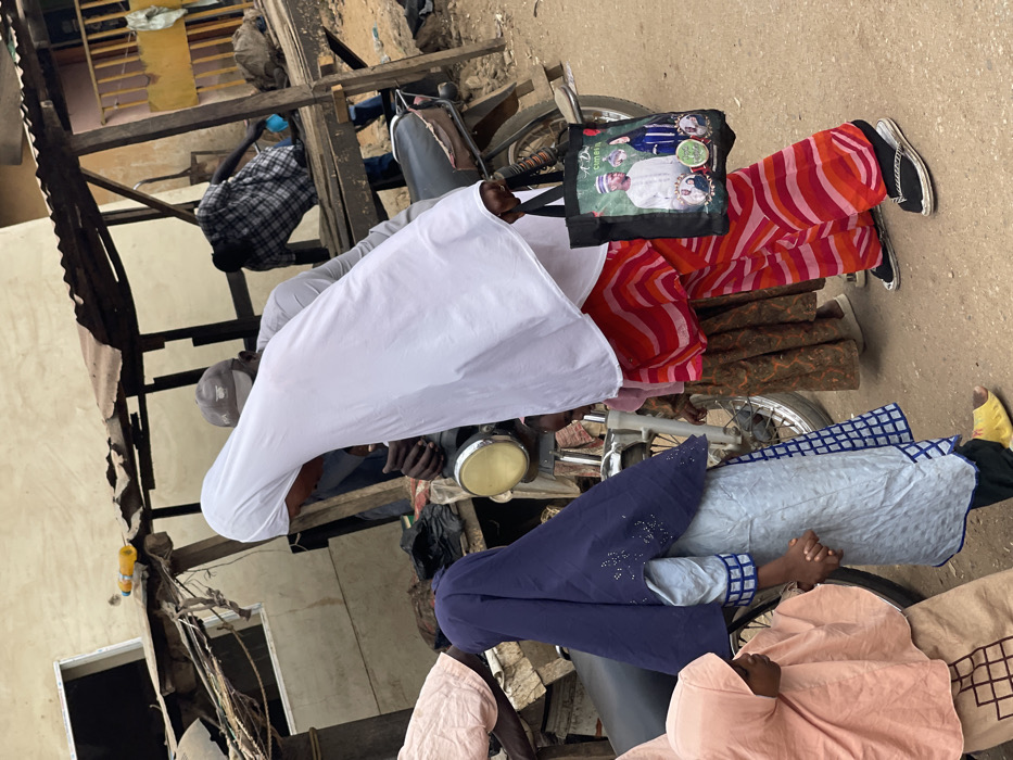 An outdoor scene in Chikaji, Nigeria, depicts multiple individuals gathered on a dirt ground near a wooden market stall and a motorcycle. In the center, a person wearing a long white hijab, red and orange striped wide-leg pants, and black sandals stands facing left, holding a black tote bag featuring a graphic of a man and woman. A small child's head is partially visible behind this individual. To the left, another person in a light pink hijab and garment sits or kneels beside a younger individual wearing a blue hijab, a light blue patterned dress, and yellow sandals; these two are holding hands. A man in a grey cap and t-shirt is partially visible behind the central figure, positioned near the chrome headlight of a black motorcycle. Further in the background, under a wooden stall with a corrugated metal roof, another person in a plaid shirt is bending over. An orange plastic bottle rests on the stall's roof. A building with a light-colored wall and a yellow metal gate is visible in the background.