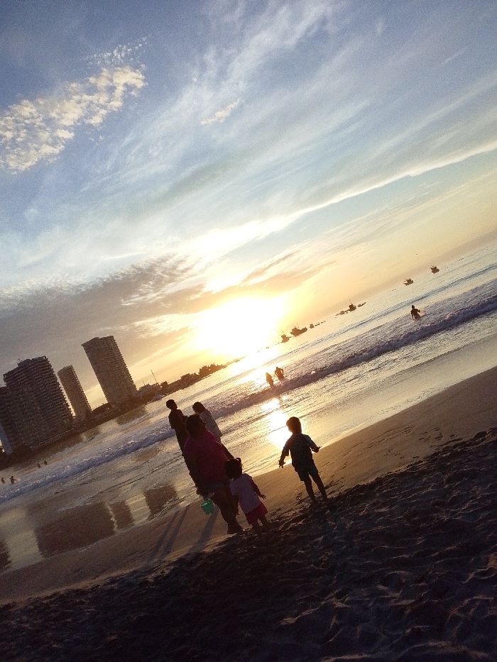 At sunset, a group of people stands on a sandy beach near the water's edge. Buildings are visible in the background. Several boats dot the ocean in the distance. A child in dark clothing faces the sea, while others stand closer to the shore. Reflections of the buildings and sky are visible in the wet sand.