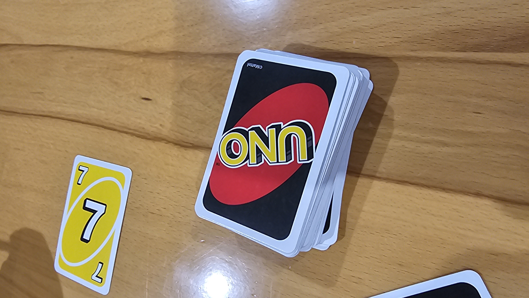 The scene is located in Leidersbach, Germany. The image presents an overhead view of a light-colored wooden surface, consistent with a tabletop, on which several Uno playing cards are arranged. A central stack of approximately 20 to 30 Uno cards lies face down, displaying the characteristic red oval background with the yellow "UNO" logo and "©Mattel" branding. To the upper-left of this stack, a single yellow Uno card featuring the number '7' is positioned face up. A partial view of another face-down Uno card is visible in the bottom-left corner of the frame. The wooden surface exhibits prominent vertical grain patterns and minor dark specks. No individuals or actions are depicted.