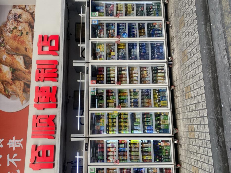 A stacked row of refrigerated beverage coolers lines a building exterior, stocked with colorful drinks. A red sign with Chinese characters is affixed to the building. Part of a food image is visible on the building's side. The coolers are white-framed, and the ground is a grey-tiled sidewalk.