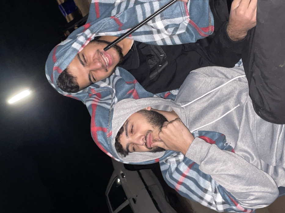 Two men lie together, bundled in hoodies. The top man, covered by a blue, red, and white plaid hoodie, smiles widely, a black straw in his mouth. A black jacket peeks out between them. The bottom man wears a grey hoodie with a similar plaid pattern around the hood. He rests his chin on his fingers, looking thoughtfully at the camera. A bright light shines in the dark background. The image appears to be taken outdoors at night, from a low angle.