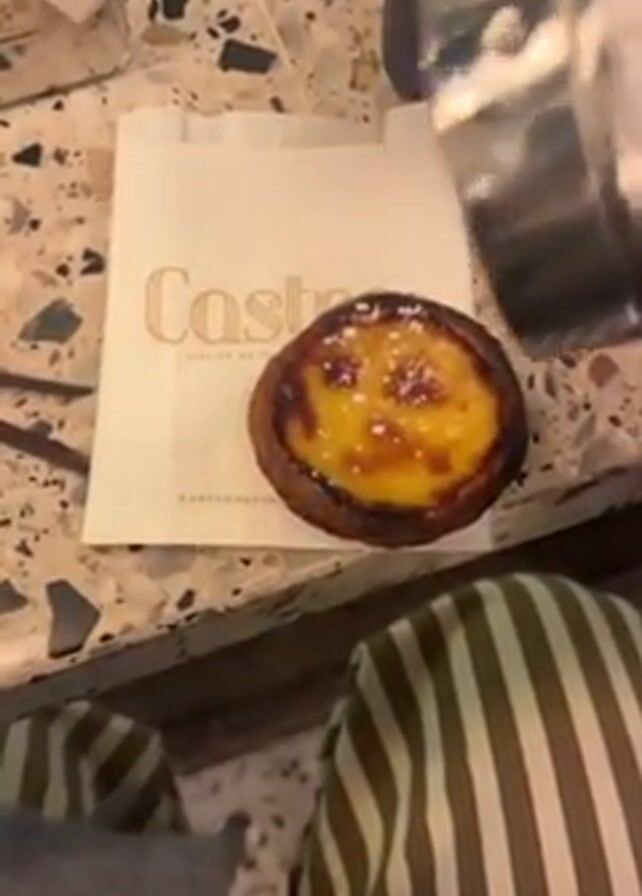 person sprinkling powdered sugar onto a Portuguese custard tart, known as a Pastel de Nata, sitting on a small paper bag with the word "Castro" printed on it