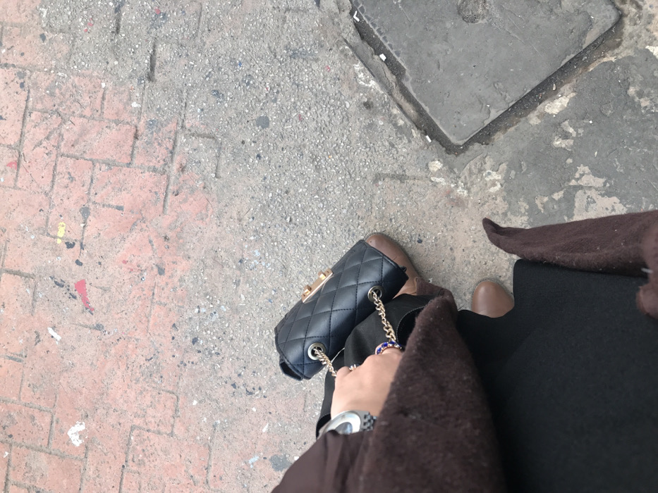 The scene depicts a high-angle, top-down view of an individual standing on a textured outdoor ground surface in Meknes, Morocco. The subject's lower torso, right arm, and feet are visible. The individual wears a dark brown, possibly wool, overcoat or cardigan, and a dark undergarment. The right hand holds a black, quilted handbag with a gold-colored chain strap and a gold-toned clasp; the bag's bottom panel is a lighter brown. A silver-colored watch with a white face is present on the left wrist, and a ring with blue and white patterning is on a finger of the right hand. Light brown/tan shoes are visible on the feet. The ground comprises two distinct sections: an upper-left area of worn, reddish-brown brick paving with scattered paint splatters (red, white, yellow), and a lower-right area of gray, coarse-grained concrete or asphalt. A square, dark gray manhole cover is partially visible in the bottom right corner of the frame. Scattered debris, including small white fragments and dark specks, is present across both ground surfaces. The overall environment suggests an urban sidewalk or public pathway.