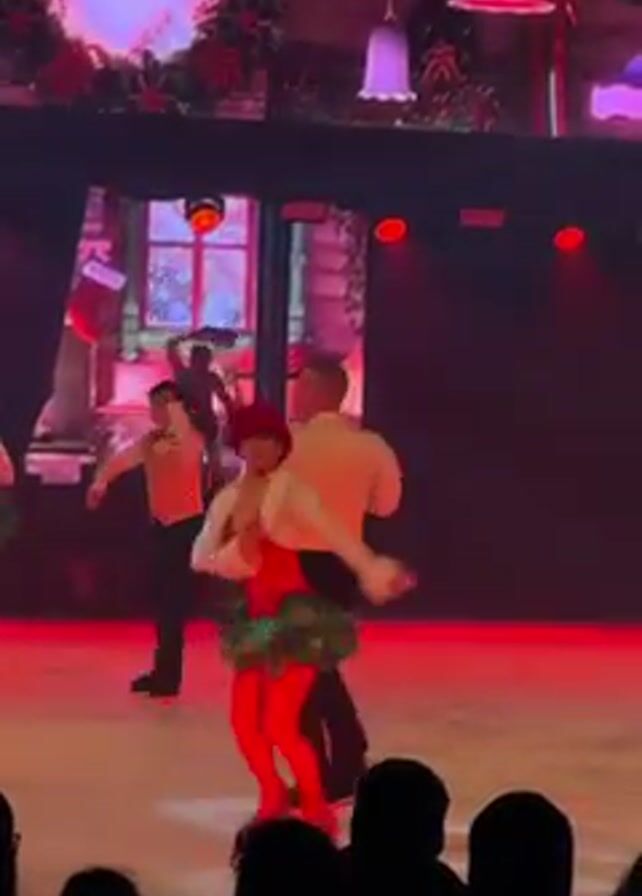 group of ice skaters performing a Christmas-themed routine on an indoor rink. The rink is lit with red lights. A large video screen behind the skaters displays a Christmas scene of a building facade with snow falling outside the windows. The skaters are wearing Christmas-themed costumes. One female skater wears a red and green dress with a tutu, red tights, and a red hat. The male skater she is partnered with wears black pants, a white long-sleeved shirt, and a sparkly gold vest. Other skaters wear similar costumes, some also with sparkly vests. The skaters are performing a choreographed dance, skating in unison. An audience can be seen in silhouette at the bottom of the screen.