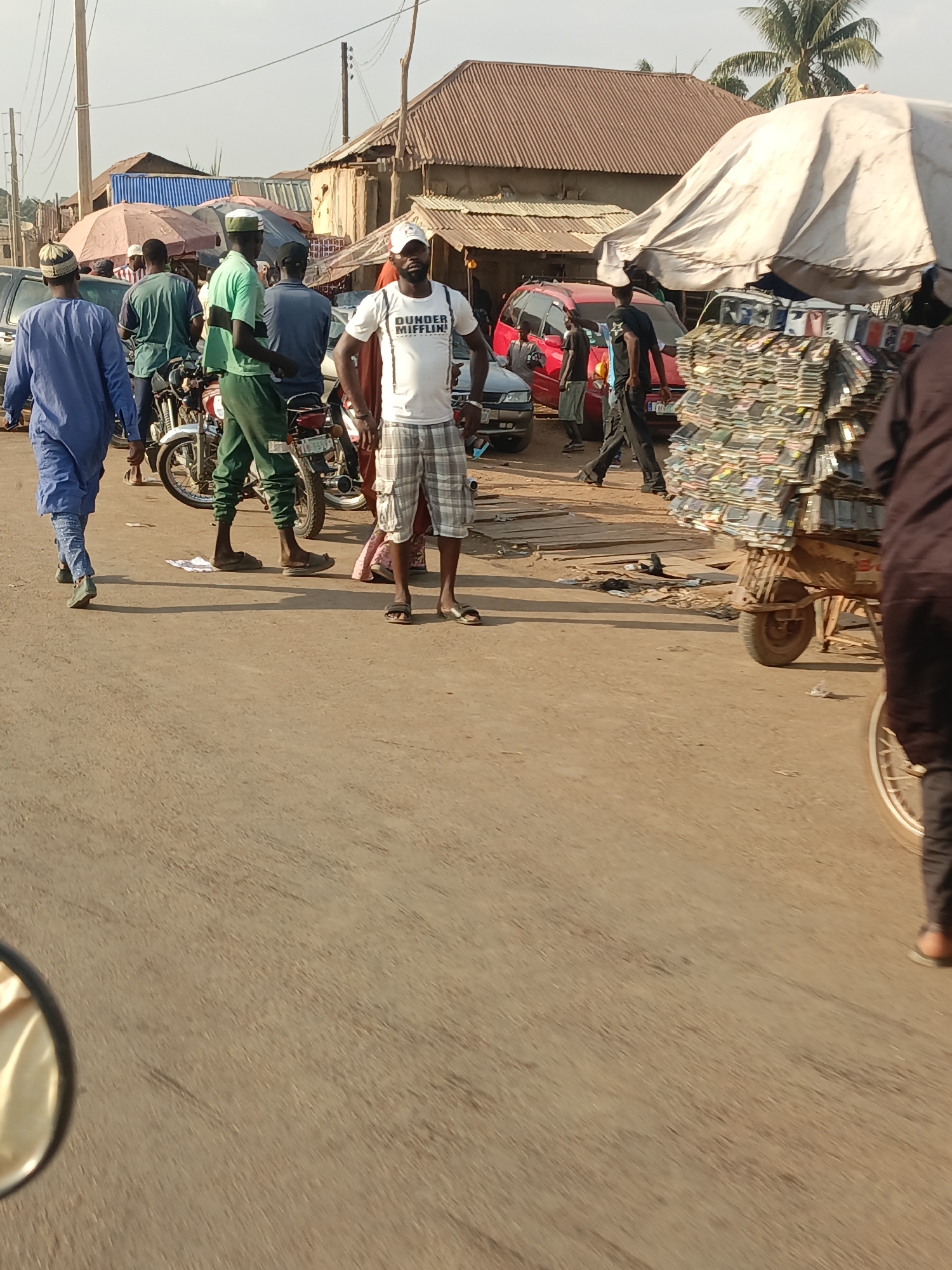 This image depicts a bustling daytime street scene in Akwanga, Nigeria, characterized by an unpaved, light brown dirt road. In the immediate foreground, a portion of a rearview mirror is visible on the lower left. Centrally, a male subject stands facing the camera, wearing a white t-shirt with "DUNDER MIFFLIN!" printed on it, plaid shorts, a white baseball cap, and flip-flops. To his left, several other male subjects are present; one individual walks away from the camera in a blue traditional garment and a cap, while others are positioned near at least two parked motorcycles. A man in green attire stands next to one motorcycle. To the right, a partially visible individual in dark clothing pushes a two-wheeled handcart heavily laden with numerous small, rectangular packaged items, possibly electronic accessories or media, which are partially covered by a large, light-colored market umbrella. The background consists of multiple single-story structures with brown corrugated metal roofs and visible walls, interspersed with additional market stalls featuring various fabric coverings, including one with blue and white stripes. Several vehicles, including a red car and a silver sedan, are visible among the pedestrians. Wooden utility poles extend into the clear sky in the background.