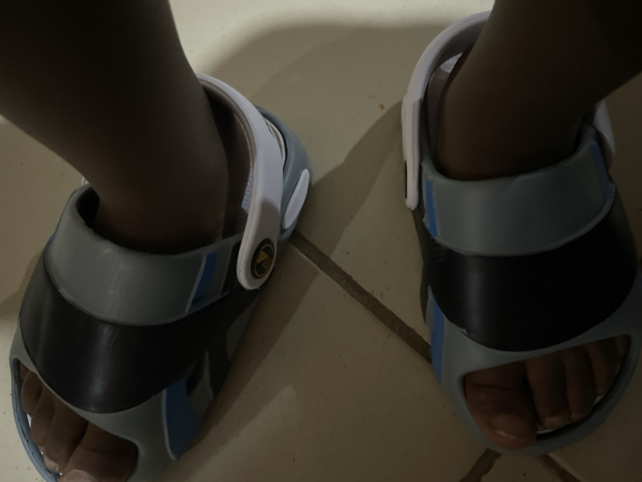 Two feet wearing light blue and black clog sandals are visible on a tile floor