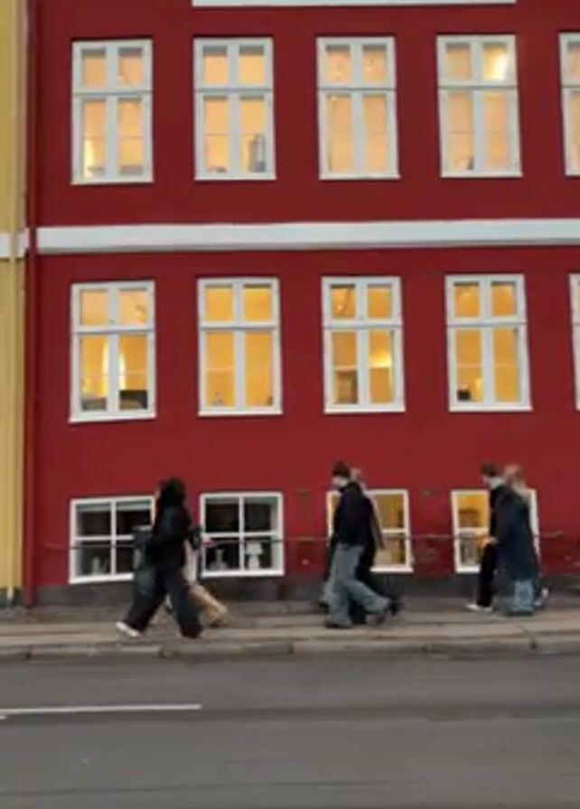 three-story red building with white-framed windows. People are walking on the sidewalk in front of the building. A cyclist passes by in the foreground. The building is adjacent to a yellow building on the left. A street separates the building from the viewer.