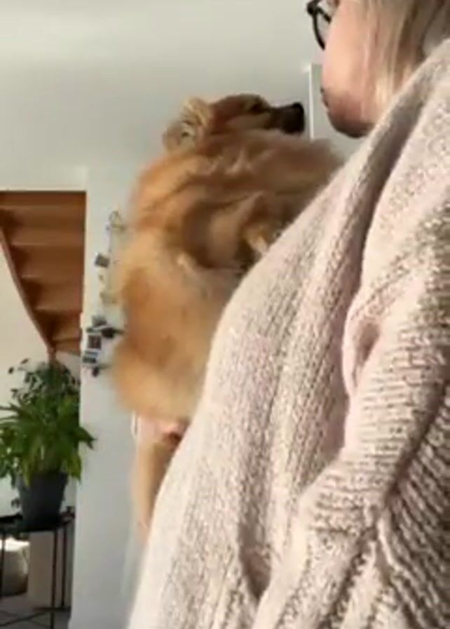 A medium shot captures a person holding a small, brown Pomeranian dog. The person, seen from the side, has blond hair, wears glasses, and is clad in a tan, knitted sweater. The Pomeranian is positioned against the person's chest. They nuzzle each other. The background reveals a home interior with a staircase, a potted plant, and decor on a white wall.