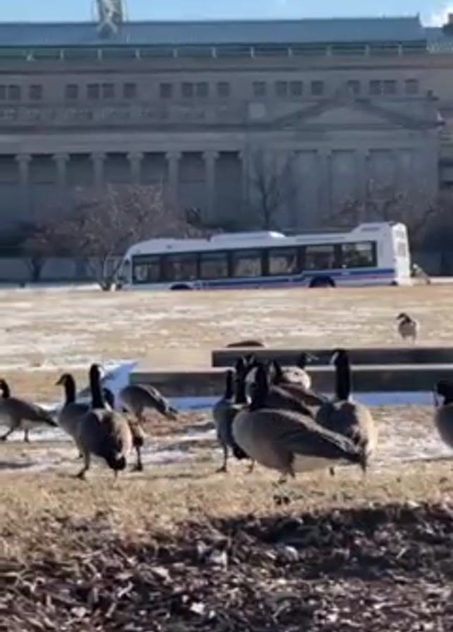 - "flock of Canada geese foraging in a field with a large classical building and a bus in the background" by FM-h5A5w1, licensed under CC BY 4.0